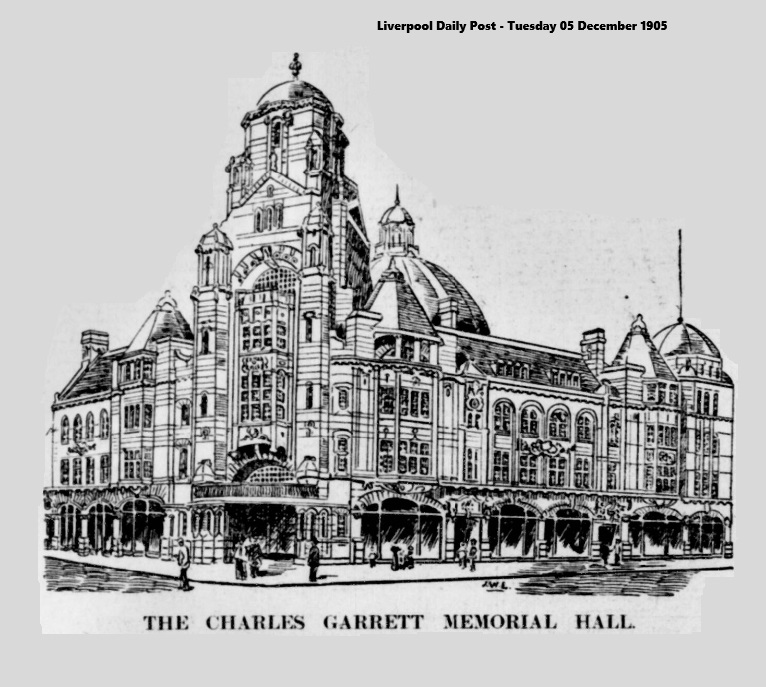 The Memorial Hall occupies a prominent site in Renshaw-street, the main thoroughfare leading to the southern portion of the city. The fine architectural features of the building give it an imposing appearance, and add greatly to the amenities of the neighbourhood, where an extensive scheme of public improvement, involving the removal of old property and street widening has recently been carried out. The old Central Hall in Mount Pleasant, for many years the headquarters of the Liverpool Wesleyan Mission was in many ways unfitted for the important and growing work carried on there. On the death of the Rev. Charles Garrett, who was so long associated with the mission, it was decided by the Wesleyan body to erect a new Central Hall as a memorial to him, and to perpetuate in the minds of the citizens for generations to come the great religious, social, and philanthropic work which he performed in the city. And no worthier memorial could have been devised then this place, where you men and women will be drawn within a centre of good influence and pleasant surroundings. According to a financial statement issued by the |Rev. Joseph Jackson, Mr. Garrett’s successor as head of the Liverpool Wesleyan Mission, the cost of the hall, furnishing, &c., will be £37,250. The enlargement and improvement of the boys’ homes, and the erection of a training home, will absorb £3,000, and there will be £4,750 for the half cost of houses in Upper Newington, and debt transferred from Mount Pleasant, making a total outlay of £45,000. Of this amount nearly £29,000 has been subscribed, including subscriptions and promises to date, £16,837; grant from Twentieth Century Fund, £7,500; proceeds of bazaar held last April, £4,616; leaving about £16,000 as the amount required to open the building free of debt. The main hall will have seating accommodation for 2,500 people, and there will be a small hall to seat 250. The amphitheatre principle has been followed in the design of the large hall, so that the whole audience can see and hear without difficulty. This fine hall will be a great boon to the city, which has been lacking in such a place, centrally situated, for public meetings and high-class entertainments. The accessories include club-rooms for young men and young women, drill hall, coffee-rooms, offices, &c.