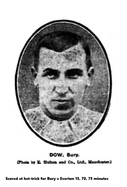 The game was resumed before quite 15,000 spectators and continued to be keenly contested. The earlier stages were all in favour of Bury, but they experienced the hardest of luck. Time after time Makepeace missed a glorious opening, and the Bury men showed their appreciation by making a raid on the visitors goal Dow easily scoring a second goal from an admirably-judged forward pass by Leeming. Both sides were now making strenuous efforts, and the utmost excitement prevailed as Bury showed something of their old-time dash and determination. A quarter of an hour from the finish Dow scored Bury’s third goal, the ball slipping through Scott’s hands, and five minutes later Everton scored from a corner. One of the finest contested games ended with the final scores; Bury 3 goals, Everton 2.