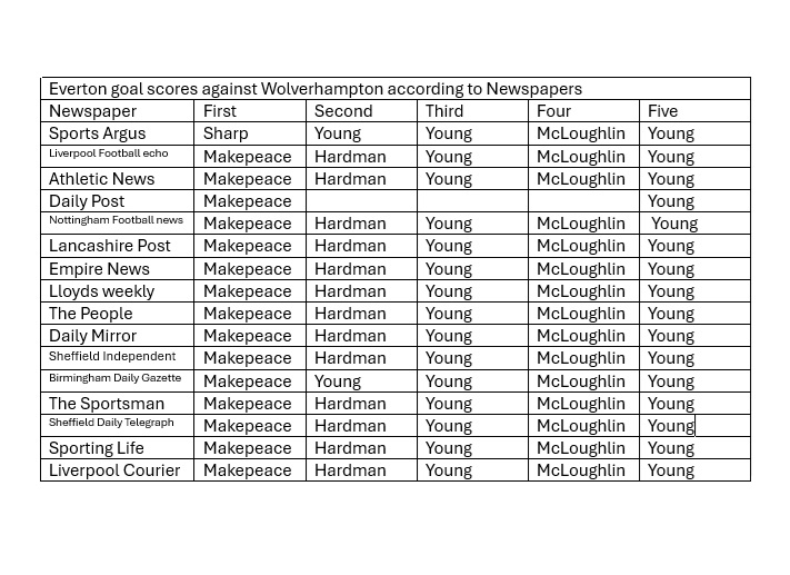 The straits to which the management of the club are put was illustrated by the fact that, in the absence of Woolridge, a veteran like Archie Goodall had to be brought into the front line. With advancing years even an artist like Archie has been, cannot now hope to prove successful a forward. This was only an instance of the difficulties with which the club have to contend. No wonder that Everton had matters pretty much their own way. Indeed from the start of the game there was never any doubt as to the issue being in favour of the visiting side. Even the Wanderers own supporters were engaged upon forecasting by how many goals their side would be beaten. The Blues had the measure of the opponents right from the start. It was quite a day out for Sharp, especially in the first half, James a local youth, had no carthly chance with the speedy right winger, and one was sorry for him at, time after time he was- left behind by Sharp, who too, did not forgot to flash across centres of wonderful accuracy. Indeed the first three goals were in large measure the result of this player's brilliant work. Makepeace signallsed this appearance as an inside forward by drawing first blood, while Hardman and Young took advantage of Sharp's crosses to completely hoodwink Baddeley. Though Everton were having it all their own way, a slip by Hill led to Smith scoring for the Wolves with a really clever shot. Before this it should be mentioned that for the first time this season Everton had a penalty kick granted against them. Balmer was presumably the culprit, but whatever was the nature of his offence was in no way plain from the press box. Anyhow it mattered little. In as much as Jones shot wide of the post. In the second half, the Wolves were seen to better advantage, and when Smith again reduced Everton's lead the spectators were quite jubilant. Their satisfaction, however, was short-lived for McLoughlin and Young each found the spot, and Everton gained one of their easiest away victories.