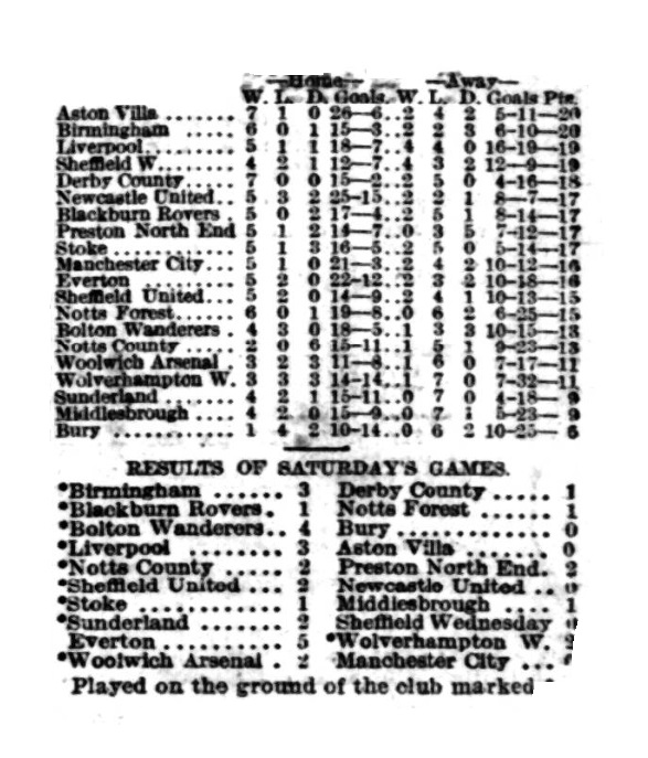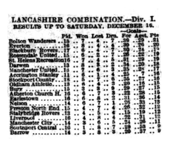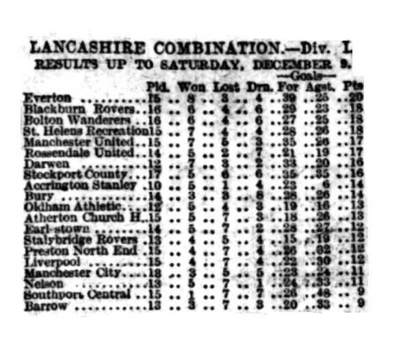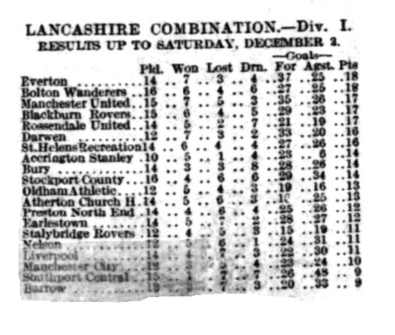 By reason of the three-nil victory over Stalybridge Rovers on Saturday, Everton strengthened their position at the head of the table. Their propress of late has been remarkable, and the side is in fine form just now. Considering that the first five games resulted in only three points being secured two of them being gained in the Liverpool match, the present record is one to be proud of. The Blues had little difficulty in beating Stalybridge Rovers who seldom caused the home defence much anxiety. At the same time Everton had to fight hard for goals, for Swann and his backs did capital defensive work. It was not until near the interval that Birnie opened the scoring, but in the second half Rankin put on a second goal with a fine long shot, and later on Cooke added another. Had the home side taken advantage of the chances they would have won by a bigger score. The forwards were smart enough till they got near goal, then they either failed or Swann and his backs beat them. Cooke is developing into a clever inside left, but is inclined to selfishness. The home right wingers were prominent and the halves sound, while the defenders were not overworked. The defence best represented the visitors. Swann in goal making some good saves.