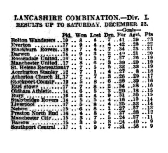 At Earlestown, before 2,000 spectators. Colonel Pilkington, M.P., started on behalf of the visitors. The homesters quickly took up the running, Wright cleverly saving from Bartley and Cunliffe. A couple of corners to the homesters were futile, and at the other end Topping had to negotiate fine efforts from Quinn and Grundy. Wright played magnificently between the sticks. Half- time; No score.