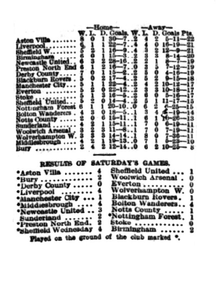 Bury defeated Everton at Bury by 3 to 2. Everton were the smarter in combination, but Bury made many dangerous attacks, and after fifteen minutes’ play Dow scored for them. For some time Everton attacked, but were driven back and several corners for the home team followed, after which Everton made strong attacks, Young equalising just before the interval. The second half opened in favour of the home team, who had several fine openings, but failed to score. Sharp was next responsible for a fearful error, and getting clear Bury worked to the other end, where Dow, put the home team ahead, Murphy next adding a third. Scott letting the ball through his hands. Everton scored again from a corner, but failed to equalise.