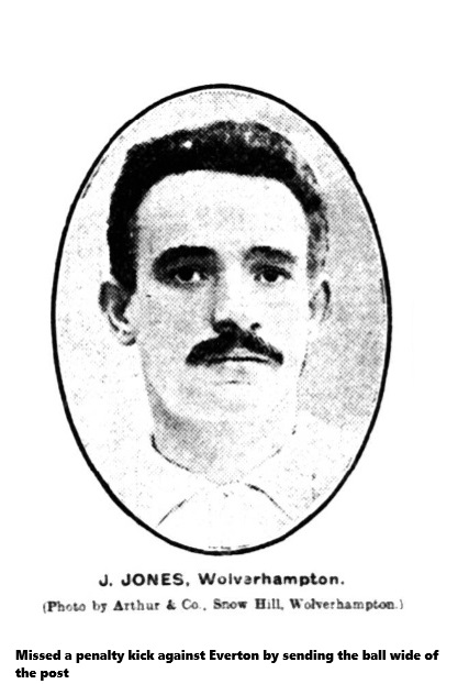Only occasionally did the “Wolves” shape like getting into their stride, but once Balmer let in Baynam, and the right-winger centred finely to Corfield, who let drive, Scott saving in brilliant style. Twice Sharp sprinted off in the direction of Baddeley, and the latter had to be smart to deal with his crosses, but the custodian should have been beaten by Makepeace, who stood close in. Goodall was playing a good game, and sent a splendid to Baynam, who forced a corner, but this came to nothing. A capital shot from Hughes was cleared. The visitors’ forwards then got down and Makepeace put in a shot and scored the first goal after fifteen minutes play. From the centre the Wanderers wet in a line for the Everton goal, and one of the backs brought Smith heavily to the ground. A penalty kick was awarded, but Jones sent the ball wide.