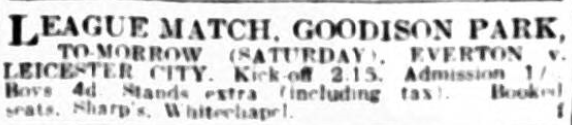 Everton throughout the first half were the more aggressive. Oldham did sufficient attacking to make the work of Common and Kennedy fairly heavy, but Maher, in goal, had a comparatively easy first half in consideration to Floyd. The Everton goalkeeper on one occasion was fortunate to find Kelly head out from the goalline, and Stainton missed a glorious opportunity giving Oldham an early goal. White scored twice for Everton, and Stein was the provider of the opportunity. Floyd made one particular fine save from Stein, and the home crowd were particularly impressed with the defensive work of Dixon at centre-half, a new signing from up North. Harris scored both goals for Oldham, the second the result of persistency in following up. Half-time; Everton 2, Oldham Ath 2.