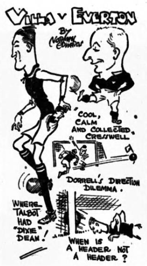 Meetings between Everton and Villa are always interesting. They bring memories of the most famous of our Cup finals. Today’s match at Aston brought some special features. Villa had won at Arsenal’s ground last week, and thus set Villa Park on fire. The sight of Dean and Waring in opposition was another pointer to make a good crowd. Then, from the Mersey point of view, there was the fact of Dunn and Weldon being omitted for Martin and Forshaw –a big break in the customary lines of Everton, Weldon never having bene absent from the side since he left Scotland save for a week ordered by the F.A. Kingdom could not play owing to flu, this being the home side’s only change. There was a fair sprinkling of visitors from Liverpool. The first news I got here was that Jimmie Gibson, the Villa half-back, far from ceasing to play according to report, actually turned out for the Colts, and his damaged leg stood the test well. There were about 30,000 spectators present at the start, the day being fine, the ground dry, and the wind rather variable. The early kick-off was against attracting a huge crowd. Everton won the toss, and Walker was at only baulked by Hart, and Creswell forced Dorrell to allow a goal kick. Forshaw’s first point was a lovely header, but, generally speaking, things were tame for some time until Hart tried to play Ritchie, and Cresswell snapped up a Dorrell run as if he were a policeman applying the handcuffs.