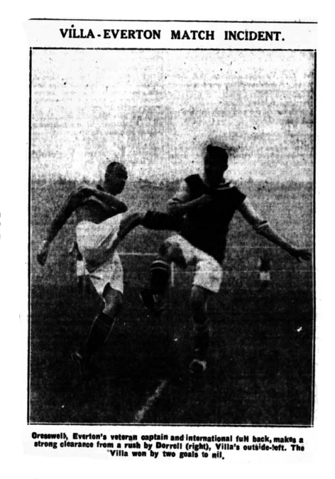 Of course everyone wants to know about the rather vital changes made in the attack. Admittedly the attack has been doing moderately for some time. So Martin and Forshaw were brought in, and two well-known Scottish members left out. Forshaw nearly scored two, Martin got the best save of the match put up for his benefit, Martin was inclined to hold the ball just a shade too long and get covered, but Forshaw and Ritchie made a telling wing, notably in the second half, when Ritchie gave admirable response with lovely centres and some close, hugging dribbling in which one would have bet he could not defeat the opposition –yet he did. However the secret of the day was the stalwart work of the two tall half-backs, Tate and Talbot, and the added excellence of Jakeman with Smart towering in the defence and “stopping at nothing,” while the clever little stiff-built Bowen was doing his share of work. I though the forwards did not court a rally with the big back. It is not wise to judge one single performance, so that judgement must be suspended; there was an idea of uniformity in the way the forwards played, but the ball did not run smoothly for them. One could not wish for better defence than that served by Cresswell and O’Donnell. Remember that Cresswell had to tackle the left wing himself in the second half, and he was studious in going it at the right moment and holding off wisely. His interventions were admirable, O’Donnell lent him much aid, and Davies could only be faulted once, yet the three suffered a severe bombardment in the first half, and at times had their luck. Had the home forwards taken easy chances the game would have been a severe rate of goals against; let us not forget that fact. And having said that, the necessity of telling exactly how well the whole ten men played in the second half must be dealt with. Villa had only a goal lead for an hour or more, and it was the was the second half that showed up the visitors as a fighting force. They could easily have snapped a goal with any degree of fortune. Indeed, they claim they were unfortunate with both goals, because each came after a slight stoppage by a defender thinking he was going to get the referee’s verdict. A linesman is said to have flagged a foul when O’Donnell was hooked down, Walker scoring through getting his head a few feet from the ground. Waring squeezed the ball through for the first goal when Cresswell had stopped for an offside call that was not answered. It was gallant fighting against a side that fielded good forwards in Walker and Beresford, and disappointed through misses by Dorrell and Waring. Had there been some good shooting the game would have turned into a brilliant match. As it was it was just hard and interesting, and very even until the closing moments. As showing how easy it is to miss a goal-scoring, I would like to put on record the incident of Saturday, when a friend from the city put me wise Walker’s goal, when with a dozen or so others, Villa and Everton people, the goal had been reckoned as Dorrell’s. Perhaps it was because Dorrell had missed so many that his name became an obsession. After the game there were fierce debates about the matter, and even now I feel constrained to write to Dorrell about it- in praise or condemnation?