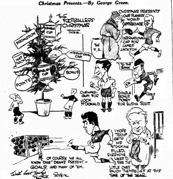 On returning from Everton on Christmas Day I bumped into Tranmere Rovers, who had made an electric return from Wigan, there taking two points from a side that will make Sheffield Wednesday go all the way in the Cup- according to my good old friend, Jackson, one of Tranmere’s long-service men, and no relative to the Scottish centre-half-back. Tranmere were in happy frame of mind through this surprise victory, and their former centre, Dean, was not quite so happy, because, although they had got a half against Sunderland, no one could debate the superiority of the forward line. Sunderland “Murdered” Everton for long stretches, and there are those behind the goal who vow that when Davies scooped the ball into the net the ball had not previously passed over the line, therefore it was a good goal. White hit the bar; so did Clunas; but really Sunderland should smack themselves for finishing such brilliant inside forward work per McKay (wanted by Everton years ago) and McInally. Halliday (wanted by Liverpool for years) was rather clumsy, but needed a lot of attention, and McInally in his own boyish manner made impish tricks in the first half to delight the eye and football sense. Troup was damaged- he pulled a muscle, so that the return of Stein is practically assured.