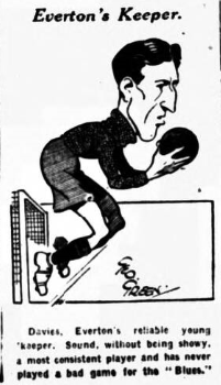 Derby County, the costless side so ably managed by Mr. Jobey, who sat in the accountants’ chair with Mr. Gillespie, of Mess Empires, and Yeoman Walker, of local laughs fame, is at Goodison Park tomorrow to celebrate the opening of another year. Everton are happy to announce that Griffiths who broke his collar bone at Aston five or six weeks ago has now fully recovered and will take his customary place. He had a trial with the reserves on Saturday and shaped remarkably well. This is the only change from Saturday’s victorious side. Everton; Davies; Cresswell, O’Donnell (W); White, Hart, Virr; Critchley, Dunn, Dean, Martin, Stein.