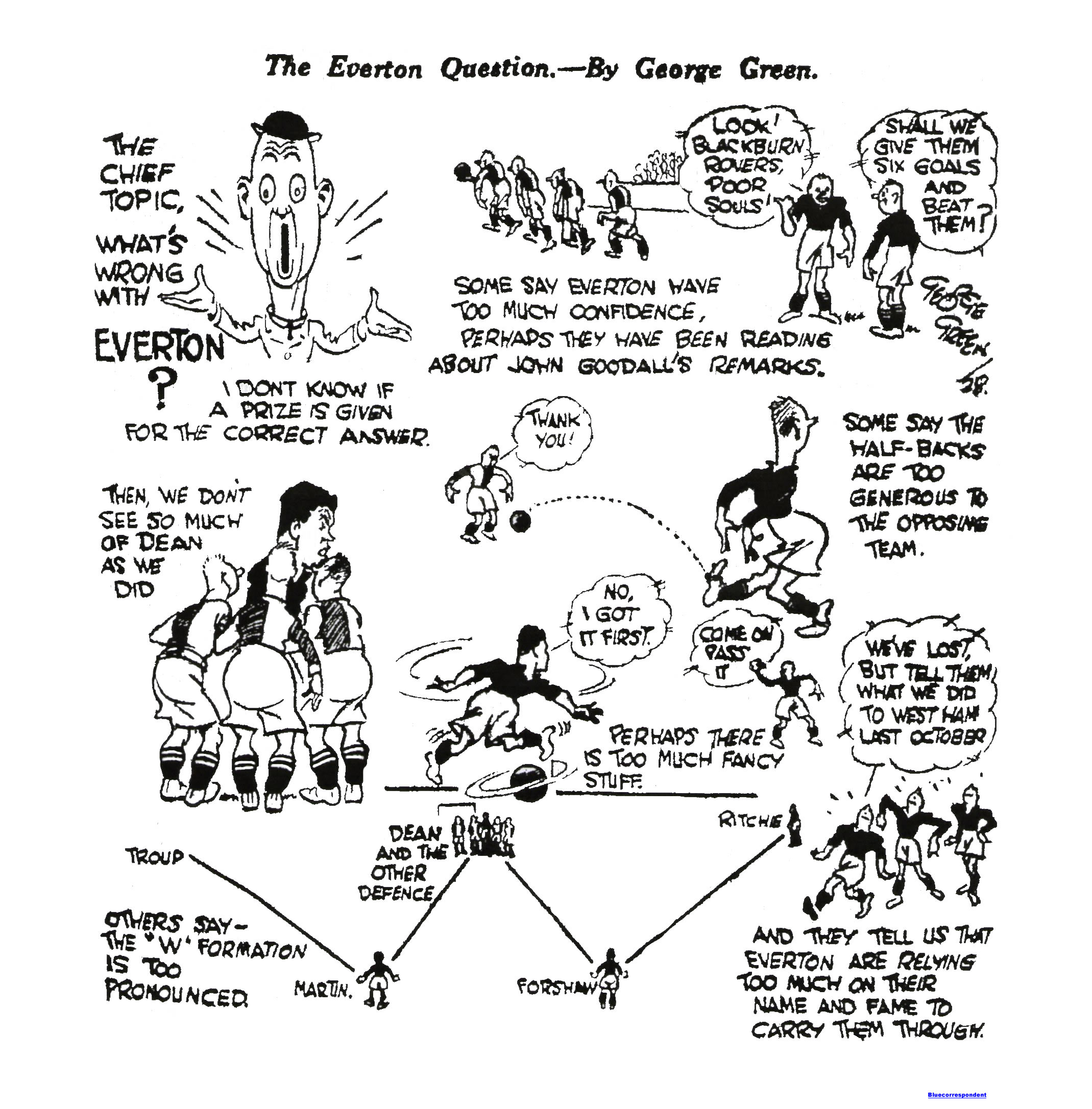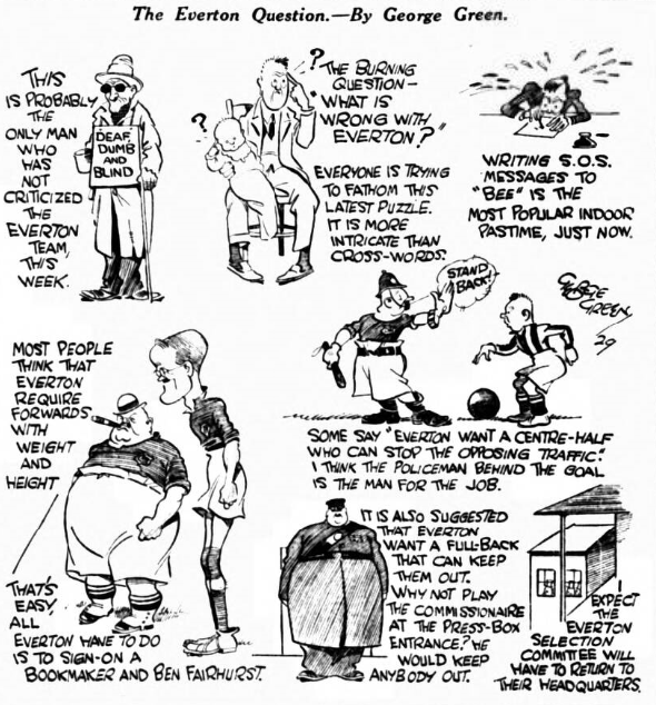 All the well laid plans of Everton have gone wrong (says Arbiter of the London ''Daily Mail.") They have not approached the standard of last season, when they carried off the League championship. The most obvious fact that Dean has declined as a scorer. For every two goals obtained last season he has only got one this, but it does not follow that this is his fault. As a matter of fact that club plainly do not take this view. They have put the blame on the centre-forward's inside partners, and for day s match against Aston Villa at Birmingham both Dunn and Weldon, the little Scottish players, have been superseded by Martin and Forshaw. Martin was secured towards the end of last season from Hull City, and was one the least expensive players signed on. Forshaw the old Liverpool man who has been with Everton for three seasons.