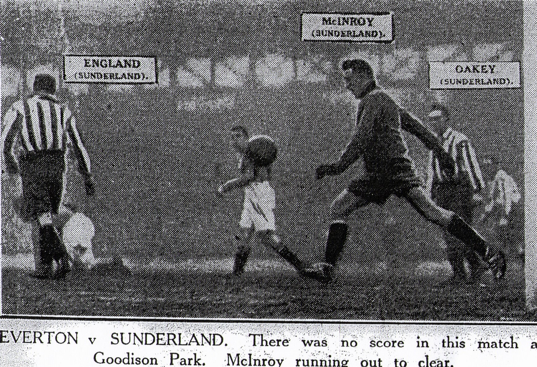 There was the essence of true drama in the Christmas day encounter at Goodison Park when Sunderland ran Everton to a goalless draw. In the last 15 minutes there was sufficient excitement to compensate for the lack of thrills during this periods when the ball was in touch as much as in the field of play earlier on. First of all Halliday missed a "sitter" –it was not the first that the Sunderland attackers had thrown away be any means; then fired in a ball from 30 yards, which shook the whitewash from the Sunderland crossbar. To crown it all, in the final two minutes the visitors won a corner, and Allan their burly pivot, ran in about 15 yards to head the ball into the net. The people roared audibly, but the referee had spotted a little bit of fouling as the ball was coming in, so instead of Sunderland obtaining a goal, the Blues were awarded a free kick. Sunderland had the better of the game territorially, but their forwards, so clever in creating openings, were absolutely inept when it came to accepting one. They were all alike in this respect, so that the Champions could consider themselves fortunate in coming through such ordeals without loss. They had ill-fortune in another respect, however, and this was that they played for the greater portion of the game without Troup, who damaged a leg early on. Then Ritchie hurt his foot in shooting so that there were only three sound forwards left to worry the solid Sunderland defence.