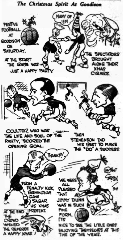 A party of 14 players made the journey North, today, and after the match they will go on to St. Annes for special Cup training. I think Everton will win and set up the remarkable figures of 11 home wins out of 12 in the 1934 portion of the season. It behoves Everton to take all these home points, for they are getting little reward for their journeys, and after Tuesday they will have eleven away matches to fulfill and only nine at home. If Everton play within 75 per cent of their form against Sunderland on Christmas Day they are certain to win. They must remember, however, that Tottenham like Goodison Park. Last season the ‘Spurs captured a point, and a few seasons ago they came and whipped the Blues 5-2. Everton did well to take a point from the Spurs at White Hart lane on the opening day of the season, and I think they will defy tradition tomorrow and win. Everton; Sagar; Cresswell, Cook; Britton, Gee, Thomson; Geldard, Cunliffe, Dean, Stevenson, Coulter. Tottenham H. Taylor; Channell, Whatley; Evans (T.), Howe, Alsford; McCormick, Hall (A.), Hunt (D.), Meads, Bellamy.