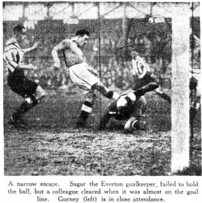 Hillier made his first save from Cunliffe, and Geldard and Williams got free kicks through rather severe tackles in which leg injuries were risked. Warren went nearest to a goal after getting beyond elbows that escaped notice. Sagar timed his run-out nicely, gathered the ball, and sent it forward. Coulter made a swinging centre and the ball was punted up the field, where Cook made a pass towards the right. Geldard was planted for a shot or centre. He shot and the ball would have gone across the goal, but Baxter stuck out his foot and turned the ball beyond his own goalkeeper. Everton one up in 14 minutes. Everton netted again but someone had handled. Dean ran on into the back of the net and a moment later shot a good one to find Hillier saving cleverly at the side of the post. Warren centred and put Camsell for honours. The centre was three yards out and shot grossly, Sager being able to make a save where he should never have had a sight of the ball. Everton were more methodical, but Middlesbrough broke away, and Williams having gone out of position, shot bard and struck Sagar. There was an exciting period with Sagar going out of his goal and failing to get this ball, later making a fine punch away.