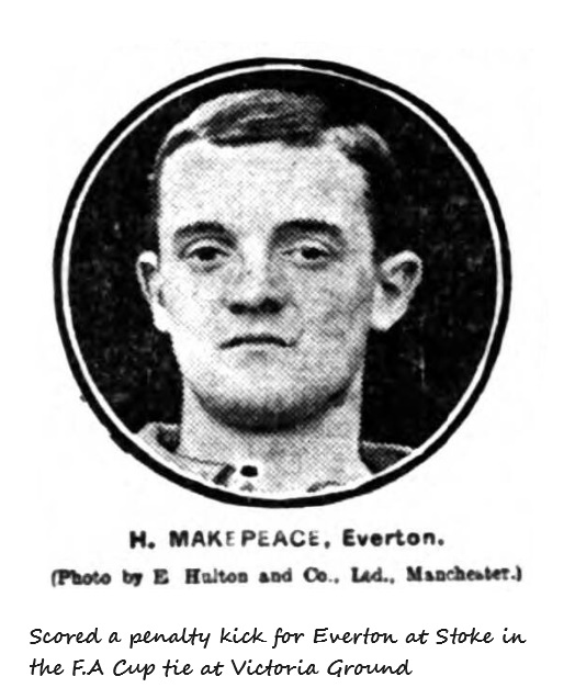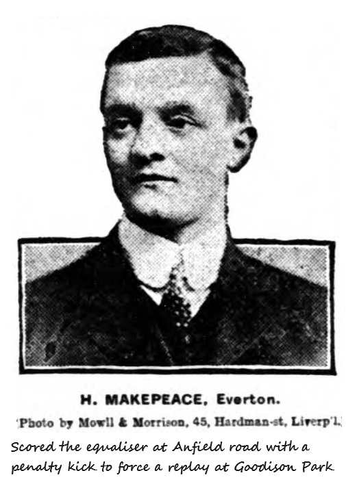 The first half of the game was not of the typical Cup Tie character, and on the Everton side particularly there was an absence of the usual method and skilful passing; indeed on both sides there was a great deal of reckless and scrambling play, and a tendency to roughness at times. On the Anfield side the forwards play was of an inferior character, but Raisbeck played a truly great game and made Young’s efforts look poor indeed. He was ably supported by West, who extricated his side from many difficulties by cool and judicious clearance. Re-starting Everton pressed vigorously, but did not make any serious impression on Liverpool’s stubborn defence, though Doig thought fit to emerge to clear one from Settle. A number of free kicks were given to Everton, but these simply meant further pressure and no score. At the other end Cox and Parkinson missed a possible chance by dilly-dallying with the ball, but further pressure brought a corner, this being headed away by Balmer. Liverpool failed owing to Parkinson, who received a pass from Fleming and got away beyond all opposition and with an open goal, made a wretched miss. Splendid work by Parry, Fleming, Goddard, and Balmer resulted in the later giving Hardman a capital opening on his wing. The outside man was closely attended by Parry, but just at this moment the game was stopped owing to an accident to Young. Then a free-kick for Everton opened up a hot attack in the home territory, but Parry and Fleming proved equal to the pressure. Soon after Dunlop stopped a rush by Sharp with a clever header, and as the onset became more strenuous on this wing Raisbeck came to the rescue, smartly changed the venue. A free kick to Everton resulted in Doig being called upon, and right vigorously ne fisted out. The attack of the Blues became more concentrated and only abated when Parry grassed Settle, the little winger being carried to the side of the enclosure. A good deal of rough work went on in the second half. Young being the chief sufferer. Ten minutes from the finish Young nearly got through, when Raisbeck brought him down just outside goal, and Mr. Lewis immediately awarded the penalty, Makepeace converting.