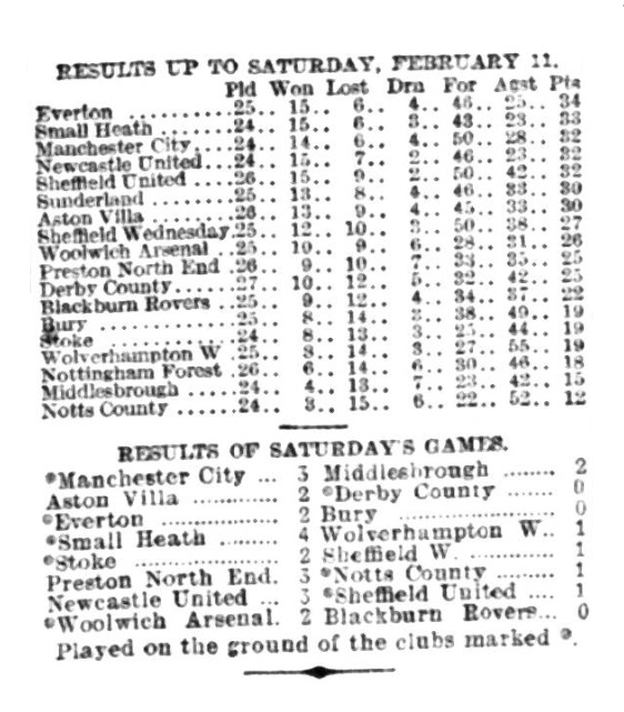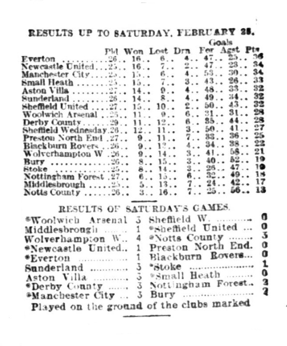 Everton are still in the proud position of topping the League. They advanced another couple of points as a result of their meeting with Blackburn Rovers at Goodison-park. True, it was a victory snatched with no small amount of difficulty- it was a goal to nothing in their favour- and at one period of the game it looked great odds against anything being scored at all. However, their supporters were satisfied at any rate so far as the result was concerned, if they were not compensated with a display of the highest class, the points were there, and that is the main consideration. In coming off victors, Everton were thus enabled to wipe out the defeat they sustained at Ewood-park in October last by a goal to nothing. Everton's prospects of retaining their present enviable position are decidedly improved by the misfortune that happened to Small Heath, who up to Saturday were only a point behind the Goodison team, with a match in hand.