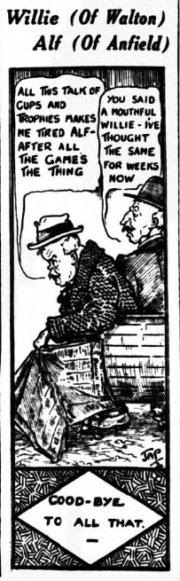 “Ontario” writes again- At the grave risk of you considering me a nuisance, I am writing again, as your answer to my letter has left me even more bewildered. Firstly may I congratulate you on the fearless way you have published my letter. No writer (pressman) In Canada and United States would have dared to do so, if it in the slightest way was criticism of a large association of society. Under the circumstances, you will easily understand how much the publication has improved me, proving as it does, the complete honesty and fairness of the English sporting writers (as we call them) I sincerely want to believe what you say, I also want my mates to do so, for although they (my mates) are the best sportsmen in the world, unfortunately, there are times when their feelings are a wee bit biased. As a Canadian without any feeling for any particular club in England, I say, unhesitatingly, that the English referees are simply magnificent, whether football, boing or cricket. I have known some of my mates to think otherwise! May I very respectfully just point out this; to you it may be enormous odds that Everton won’t meet Liverpool in the final, but it you take a ten mile radius round every city in England the odds that two clubs in one such radius meeting are less than 4 to 1; actually, mathematically they are only 3.76, but you say that such a thing hasn’t happened for nearly forty years. Then, I am told 5,000 spectators was a very respectable gate, and the professional footballer as known today, didn’t exist.