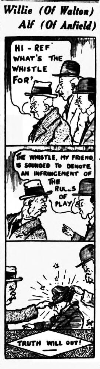 Supporters are important persons in the great winter game. The team "supporter" is elastic, for whereas some people merely attend matches, pay their shillings, and claim to give support to a club when thing are running smoothly, the real supporter is the man who willingly braves all weathers to see his side whether they are doing well or badly. In addition, the real supporters is he who considers himself an important part of the club he is supporting, not in the matter of management, but just because he has that something which makes him look on the club as his own. He is not presumptions in this feeling of possession, but gives his all for the well-being of his own team. To him it becomes not merely Everton, Liverpool, Aston Villa or Huddersfiled, but "my team."