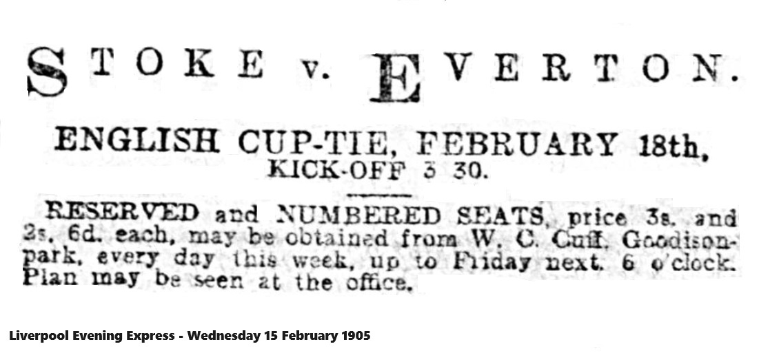 Some misapprehension seems to exist with reference to the charges for Saturday’s Cup tie between Liverpool and Everton. The only tickets on sale in advance are for the numbered and reserved seats 5s each and these can be obtained from the club’s agents C.W. Bullock, and Co, 22 Lime-street. The admission to the ground, including goal stands will be the usual 6d; for all other stands, excepting reserved an additional charge of 1s 6d will be made. Should the weather be suitable, seats will be placed inside the barriers, for which the charge will be 2s 6d additional; but no tickets will be issued except on the ground for this portion.