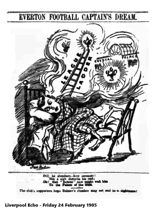 They have never won the Cup, but have twice been knocked out in the final. In April, 1900 after beating Everton by 3 clear goals at the Dell, to which ground they had now gone the Sotons claimed another record, for they were the first Southern club engaged in the final tie for eighteen years. Bury, however, were too clever for them by 4 goals to nil. They were again at the top of League affairs in the next year, and in the Cup tie Everton had their revenge with a victory of 3 goals to 1. In 1901, after Everton had been beaten by Liverpool at Goodison in a replayed tie- the score was 2-0-the Saints reproduced their cup-fighting form, and beat Liverpool by 4 goals to 1, prior to which they defeated the ‘Spurs after three meetings. They had sweets of victory over Bury, their former conquerors, and worked through to the final again, only to return defeated after a drawn game, by a goal margin. They comprise the real hope of the South this season, and, therefore one realise how strong will be their efforts to justify the trust. The match at Goodison will probably provide the titbit of the round, and by the way, Mr. W.C. Cuff, Sharp, Sugg, and Bullock are being inundated for tickets. A record crowd is looked forward to. There is no increase in the 6d portion of the ground, but the cheapest stand and promenade is 1s 6d, the next highest 3s (inside the reserved portion) and the highest 5s (for reserved and numbered seats). All the first team members and Tom Booth, R. Balmer , Rankin and McLoughlin went to the brine baths at Northwich yesterday, in charge of a director and Trainer Elliott. Settle’s injury it appears was a blistered heel. He will be ready for service by Saturday. The men place no moment on the defeat of their visitors on Saturday, by West Ham, because all reports agree that the losers were the better team, and that defeat is likely to nerve them up for more serious work.