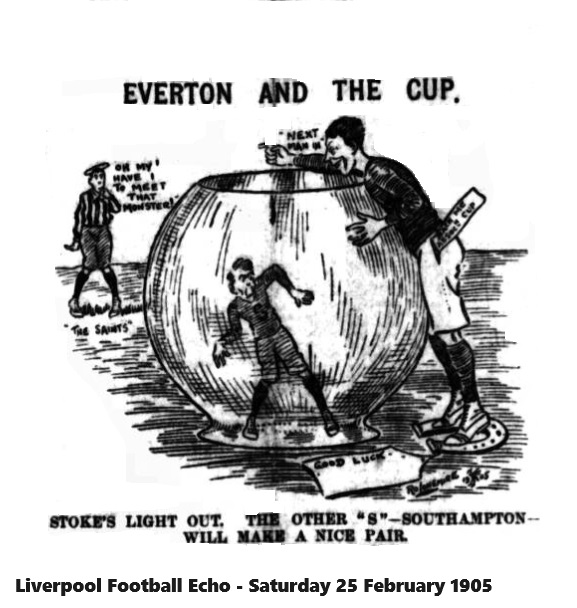 The above match, which takes place at Goodison-park, on Saturday next, is recognised as the “tit-bit ” of the round, Everton having vanquished Liverpool and Stoke, while Southampton has beaten Millwall and Wolverhampton Wanderers. The Southerners are undoubtedly the cleverest combination in the South, having won the championship of the Southern League no fewer than six times, and they are also in the running for the championship this season. Everton’s record in the League tourney is particularly good, and they are at present the leaders. This being so, the match may be looked upon as a trial of strength between the English league and the Southern League. Everton and Southampton have met an two previous occasions in the English Cup-tie tourney, both matches taking place on the “Sotons” ground. The first meeting resulted in a win for the home side by 3 goals to 0, but on the second occasion the score was 3-1 in favour of Everton. As will be seen by our advertising columns, reserved seats may be booked at Goodison-Park (Mr. Cuff), Sharp’s, Sugg’s, and Bullock’s.
