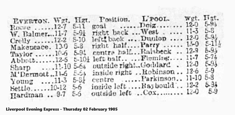 Everton.- L.R. Roose, goal; R. Balmer and Crelley, backs; Makepeace, Taylor (captain), and Abbott, half-backs; Sharp, McDermott, Young, McLoughlin, and H.P. Hardman, forwards. Referee Mr. F. Kirkham, Preston.