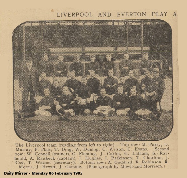 The following were yesterday afternoon chosen to represent Liverpool F.C against Everton at Anfield- Doig, goal; West and Dunlop, backs; Parry, Raisbeck, and Fleming, half-backs; Goddard, Robinson, Parkinson, Raybould, and Cox, forwards.