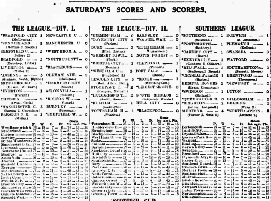 Everton: - Mitchell, goal, Bissett, and Evans, backs, Peacock, Lievesley, and J. Robinson, half-backs, Jones, W. Robinson, Gault, Clennell, and Donnachie, forwards.