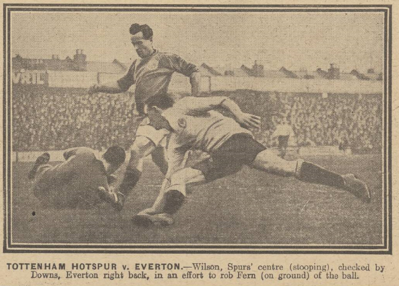 About the Evertonattack there was one big virtue-the shooting, and also a big fault- they gave up much too soon when a dash might have made the work of the Tottenham defenders much more difficult. Crossley and Harrison constituted the better wing, for the outside left played splendidly throughout, cutting in and shooting well on at least three occasions, Irvine could not find the way to the goal, and he did not swing the ball out to the wings much. Still, the Everton forwards did not get the support which was accorded to the home front rank. There was most promise in Hart, and I could have imagined him playing even a great game if Walden had not been such a terrible handful. The same remark applies to Livingstone at full back, for he often kicked well, only to be frequently beaten by exceptionally trickery. All things considered, perhaps Downs was the most impressive Everton player. True, he booth ballooned the ball and kicked into touch, but was always doing something effective and in the second half, when the forwards were giving up, Downs dashed up among them time after time. The right full-back was a tireless worker, with the never-say-die spirit. Fern kept a splendid goal, and was in no way to blame for the defeat. Tottenham Hotspur; Jacques; Clay, McDonald; Smith, Walters, Grimsdell; Walden, Seed, Wilson, Bliss, and Dimmock. Everton; Fern; Downs, Livingstone; Peacock, Fleetwood (Captain), Hart; Chedgzoy, Fazackerley, Irvine, Crossley, and Harrison. Referee; J.T. Howcroft, Bolton.