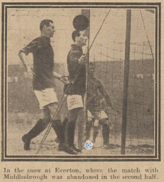The conditions of Goodison Park were altogether against outdoor sport. Snow began to fall two hours before noon, after which there was a slight cessation, only to be followed by a heavy downfall that eventually brought the game between Everton-and Middlesbrough to an abrupt termination twelve minutes after the resumption. With a desire to complete the game if possible, no interval was taken but the referee had to call a halt, as the lines became obliterated. What play there was reached quite a good standard of efficiency, and reflected the greatest credit upon all concerned. Everton had the greater share of the game, but the Middlesbrough forwards were not combined as the home line, their finishing touches were more direct and forcible. Owing to injuries, J- Carr and W. Carr stood down for and Ellerington, while the return of Fern brought the Everton team to full strength. Fern was kept busy by G. Carr, Urwin, and early on, but it was the other end where most of the play was centred, though it was not until five minutes from the interval that Harrison’s charge was penetrated.