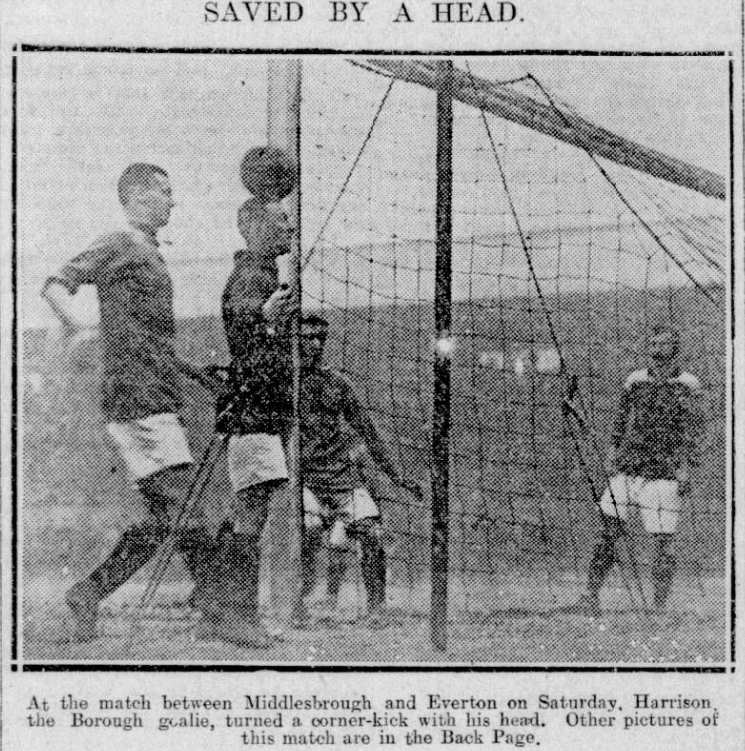 Everton’s rise is still troublous. They are not safe, yet they have improved their position to a large extent through that eventful meeting with the Villa. Tomorrow, with Wilson and Marshall away, the Everton fellows have a chance to make very good progress, and with Fern reappearing I think they will manage to extract the double dose. With the going sloppy Everton must needs hit the ball hard, often and from any reasonable angle. They will be meeting in the Boro’ goal one of the most talked-of custodians, and one of the best in the land. Here’s good luck to them at home, and on Wednesday next at the Villa ground, and in the interim here’s a wish for good games for all our local representatives in the international, and in the Bradford game on Monday. Everton; Fern; Down, Livingstone; Peacock, Fleetwood, Hart; Chedgzoy, Fazackerley, Irvine, Crossley, Harrison. Middlesbrough; Harrison; Holmes, Fox; Davidson, Carr (W), Pender; Carr (J), Birrell, Elliott, Carr (G), Urwin.