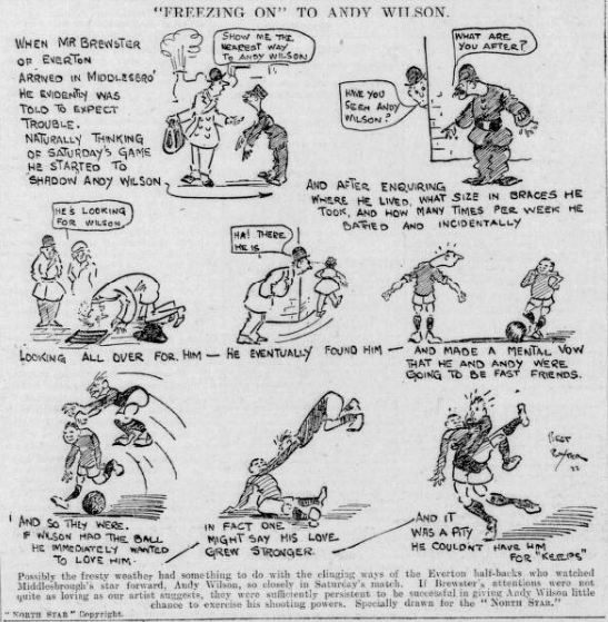 Today marked a special niche in the Everton history. It was the thousandth League game of the only club that has never been in danger of going into the Second Division, Middlesbrough were their rivals at Goodison Park today, and it was a pity the local folk could not have the pleasure of the company of Andy Wilson and Marshall, for both are artists, and were needed by Scotland. Wilson’s name has been associated with Everton in recent weeks, but there is no “fear” of his coming to Everton. Fern, after his solitary league-game miss, was reinstated in the first team; otherwise there was no change. On Wednesday, by the way, Everton go to the Villa ground, and the match becomes unusually interesting, in view of the affairs of Goodison Park a fortnight ago