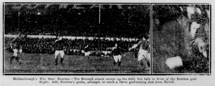 Even so far as it went it was not a good game-the conditions were too bad for it to be of the best, and the hardy 10,000 who did go to see it did not see much whichever way the expression is applied. There were occasionally movements on both sides which led to some excitement, but on the whole the ground was too treacherous for any of the those fine touches which go towards making a game really interesting. A greed the players did their best in bad circumstances, and all credit to them. Middlesbrough were not playing like a team that deserved an adverse score. Indeed there was little to choose between the sides. In the early stages the visitors were the more dangerous. And it was only three splendid saves by Fern that prevented the Everton goal failing twice to Elliott and once to G. Carr. On another occasion Carr went through the defence, but ended up by shooting just about two inches wide, and yet again Fern made a brillaint save from the Middlesbrough inside-left. Later, Everton got closer to work and Harrison in the Middlesbrough goal was called into action. Irvine struck the crossbar, and Holmes was fortunate to head out from the rebound. Then Harrison, the Everton outside left, put in a tremendous drive and gave his namesake something to think about. Hart sent in a tester from a free kick, and Crossley gave trouble with a nice hook shot. Everton, if anything, showed slightly the better balance and Fazackerley, Harrison and Chedgzoy were the most prominent of the home forwards. Urwin, G. Carr and Mordue stood out in the Middlesbrough line. Ellerington. Peacock, and Hart were the best half backs of the day, and Fern and Harrison in the respective goals were bang up to form.