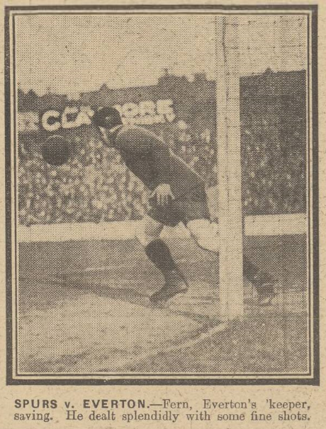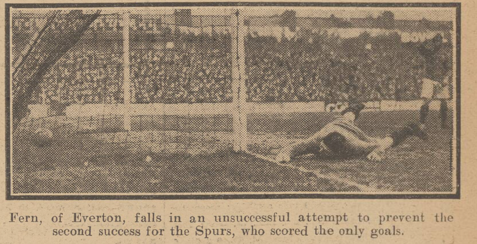 Pretty work on the part of both sets of fast backs gave the crowd a glimpse of clever football in midfield, but it rather served to show that the finishing touches of the forwards were woefully lacking. Fazackerley was once well placed when he allowed McDonald to beat him easily; and after Irvine had tried to get through without success Crossley put in a very hot one. Everton were now warming to their work, and Harrison getting away like a grey-hound flashed in a centre which glanced off the post into touch. It was a very narrow escape for the ‘Spurs. Apparently they realised this, for they swept along in combined order, and following upon good work by Walters and Grimsdell, Wilson sent the ball wide off the target.