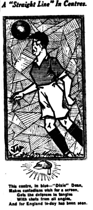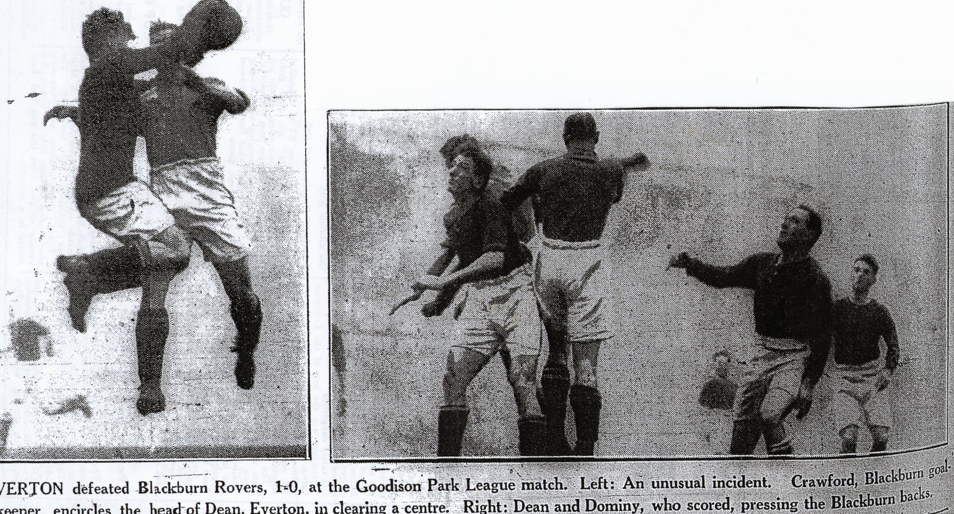 By Stork who would have thought it? Everton, whom many think are already in the Second Division, bearded the lion in his lair and, after a rousing battle, came out of the duel with honours divided.  Huddersfield, three times champions, and at the moment in a fair way to winning the title for the fourth successive year, were not only held up by Everton, but were nearly defeated by the new “Blues” for Dean, who placed the ball in the net in the second half, is emphatic that it was a genuine goal, for although he agreed that he was in an offside position the very fact that the ball struck Wadsworth ere it reached him was sufficient evidence that he was automatically placed “onside.”  On that statement Dean appears to be fully entitled to his opinion, but whatever Dean or anyone else had to say goes for nought if the referee decided otherwise, as he did in this particular case.  What the loss of that goal means we all know.  Two points would have been invaluable, but the one gained will not lose its usefulness when the final reckoning has to be made.