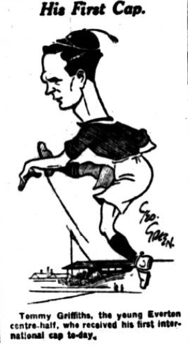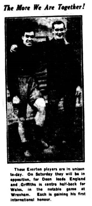 Everton visit Leicester on Saturday to resume their struggle for League points, and compared with yesterday's side a new half-back line is to turn out. Griffiths, the former Wrexham half-back has been selected to fill the pivotal position in place of Hart, and this will be the Welsh player's first appearance in the senior team. As he is to occupy a similar position in the Welsh team against England on the following Saturday the experience should prove beneficial. Brown resumes in place of Rooney, and Reid comes in instead of Virr, Critchley again appears at outside right. The team is; Hardy; McDonald, Kerr; Brown, Griffiths, Reid; Critchley, Irvine, Dean, Dominy, Troup.