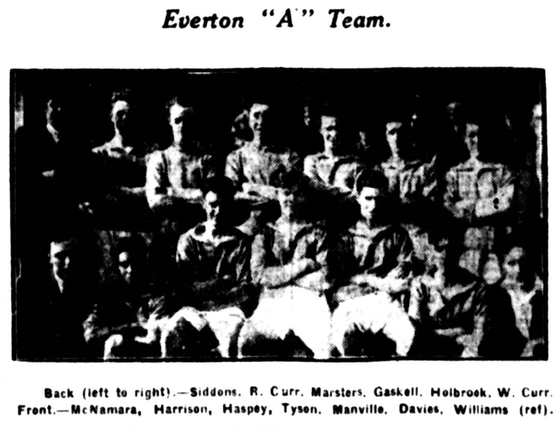 Reserves (v. Huddersfield Res, Goodison Park, 3.15); Kendall; Hamilton, Kerr; Bain, Griffiths, Rooney; Millington, White, Paterson, S.M. Beswick, and Kendrick. S.M. Beswick, the Nomads amateur, thus makes his first appearance in Everton colours.