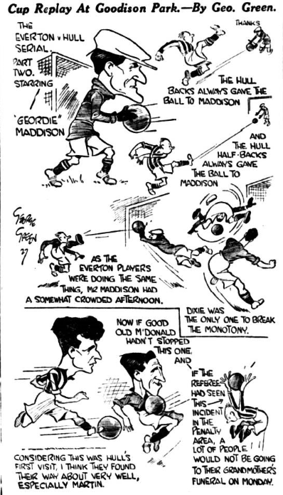 So we go to Villa Park, thanks to the toss of a coin, Hull and Everton having disagreed over the neutral ground (Leeds or Birmingham).  Villa Park was the scene of Everton’s former triumph in a semi-final tie against Liverpool, where they won 2-0.  So they have something to encourage them.  They’ll need it if Hull continue to plug on as they did through yesterday’s second half display.  I have no patience with those who after the game decry the home side as being this, that and the other and all very useless.  If one had taken a plebiscite of the crowd at half-time we should have been faced with two concrete facts; Everton were due for a victory, and a well-deserved victory, and Maddison had been a hero.  Now take the plebiscite this morning, and you find that memories are short lived.  I am not out to make excuses for a side that in the end was perhaps fortunate to escape defeat; but I am out to say that this was a good result, because neither side deserved to lose.