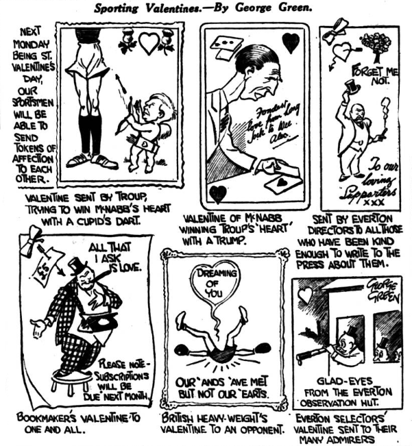 The morrow is fraught with a big Cup points, all of them rather prickly.  The draw for the next round has only heightened the appetite for tomorrow’s replay.  I see one of the critics has ticked off the Cup draw in a nonchalant manner, thus; “Not an inspiring draw.”  Well, to be frank; I think if one had the opportunity of having the draw “face upwards,” as they say in cards, you could not have paired them off more equitably than Fate paired them yesterday.  I think it is a joyous draw, promising rich sport and a lot of speculation.  It leaves us with a doubt about Everton and Liverpool, owing to the replayed ties tomorrow.  There is no need for further comment upon the Cup draw, except to say that if Bolton do not get through tomorrow there will not be a match in Lancashire, and there will be four in and around London.  Is this to be London’s long-delayed year?  Everton meet to-night to select their team, and I imagine that the big consideration is concerning outside right.  I am not going to anticipate anything regarding the team sheet, and shall simply place Mr. Query in the position of outside right.  If the weather holds out well there will be an enormous crowd, the game having caught the public of his City, and this being the first view we have had of the famous Hull defence, in which Maddison’s seemingly care-free style of fielding the ball will tickle your risibilities.  Hull are plainly not satisfied with what happened on their right wing, and they are talking of changing the inside left (clever fellow) over to the right wing.  This is a pity, because it prevents your seeing what a fine understanding there is between Taylor and Martin.  This is the plan of the field as far as can, at this stage, be made out;- Everton; Hardy; McDonald, Kerr; Peacock, Hart, Virr; ?, Irvine, Dean, Dominy, Troup.  Hull City; Maddison; McGee, Bell; Swan, Dixon, Bleakley; Martin, Scott, Whitworth, Gulyan, Taylor.  There has been a rare rush for the tickets, which will be on sale to-morrow till twelve o’clock at Goodison Park and Sharp’s Whitechapel.