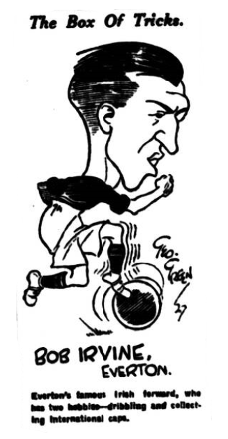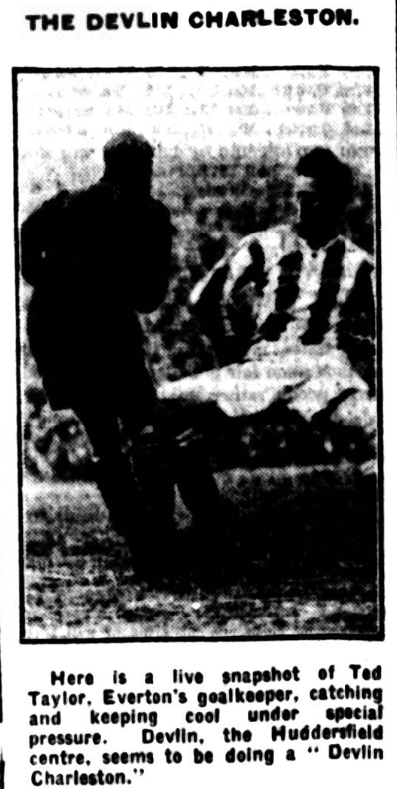 I am not going to individualize, but I must pay tribute to Bob Irvine, who gave up his international cap to help his club.  He has never played better. No player has been so severely criticized for his desire to over-elaborate, but in this game he opened out the play with wide passes, and if he goes on in this manner he will soon force his critics to hide their heads.  He was, to my mind, the best of the Everton forwards. I was informed after the match that Kelly played the last quarter of an hour in a dazed conditions.  Dazed or not dazed he was splendid throughout.  It must be some considerable time since Bob Kelly was so completely held.  He found Virr and O’Donnell too much for him, while W.H. Smith, one of Huddersfield’s most dangerous forwards was in the same boat with Kelly.  Devlin was a disappointment, and the home crowd would rather have Brown in the centre judging from their call from around the ground.  “We want Brown,” they bawled, and when that player changed place with Devlin there was certainly more liveliness in the Huddersfield front rank, and to an extent greater danger to Everton.  Wilson was the best of the half-backs, but Smith did exceedingly well against Dominy and Troup, but as in the case of Everton it was in defence where Huddersfield were strongest.  Turner in goal is only a boy, but there is a future for him.