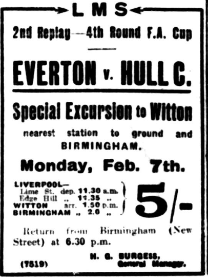 For the Everton-Hull game at Villa’s ground on Monday, Thomas Cook and Sons are running an excursion, leaving Lime-street about 11.15, fare 5s return.  The Everton Club have 5s tickets for this match.  The team leaves for Leicester on Friday (central 4.5), and after the game travel to Droitwich, where they will stay until Monday.