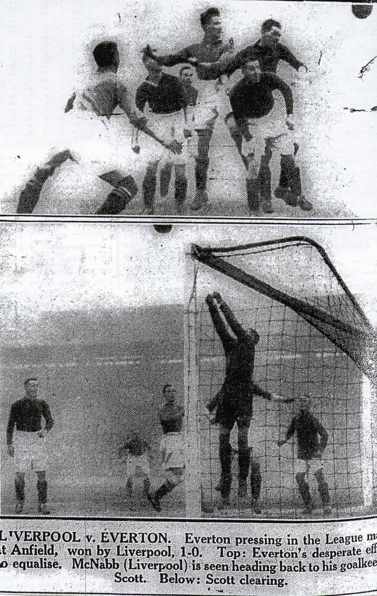 No wonder one scratched one’s head. The match was a jumble, and at the end only were happy. They pulled' up a precious point while most of their rivals stumbled.  What is more, they earned it, and will make more progress and perhaps pull out of the mire-if, as all the world expects, they borrow more plumes for their attack. For the defence is now good enough to make the desired recovery. Cresswell has been an inspiration. His quick, cool foot and head raised the hopes the team at Huddersfield in a trying first half, when the battle was really decided. He challenged W. H. Smith—of late in his very best form and demanding of the England selectors that they shall reconsider his claims—and Smith, having been bed for two days, owing to influenza, faded out. This was checkmate, for the rest of Huddersfield’s attack was not the high standard the Champions have set—far from it.  But Taylor also struck a vital blow, for there was series of clever close-range saves in this half which kept the Town bay. It would be unfair, however, to suggest that Cresswell and Taylor pulled Everton through. O’Donnell has improved with Cresswell as his companion back, and Hart set the example Everton need by keeping cool and keeping the ball on the ground'.  At wing half-back was the some stability, and that is why I say that Everton’s defensive dangers appear to be at an end.