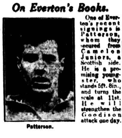 Everton have signed Patterson, a young Scottish centre forward from Camelon Juniors. He stands 5ft 8ins, and weighs 11 st , and is regarded as a player likely to diverge into a good forward. He may be introduced to Everton's centre League on Saturday.