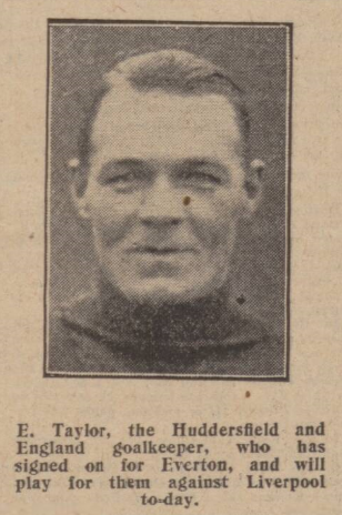 Critchley did brilliant things that took a fancy of the crowd, and then was variable. He must be prompter at times in crossing the ball. On the other wing Dominy, another fine team man, wanted just that little extra speed to make an effective partnership with Troup, whose ability we all know. As indicated, Everton's defence gives confidence. Cresswell, who works in little room, was seldom, if ever ruffed, and he was meeting in W.H. Smith –happily associated with Brown –one of the finest wingers in the country. Cresswell's coolness was also reflected on O'Donnell, who is settling down a sound, orthodox game. Ted Taylor, on renewing acquaintance with his old ground, was greeted with musical honours, and there was also a cheer for Dixie, who, it will be recalled, had his first try out in a reserve game on the Town ground after his motor-cycle accident. Taylor again gave of his best, particularly in those hot moments in the first half, when he picked up four times in succession, but both Taylor and Turner had comparatively few close-up shots, and they were unbeatable at long range. In a commendable desire to keep the game in hand, Referee Shuker used a great deal of whistle, ad Everton fell under the ban a great deal. Dean was once penalised for impeding the goalkeeper, and was pulled up rightly, it seemed from the stand, for offside, when he netted, although Dean was confident the ball went through off Wadsworth, who, by the way, was Huddersfield's stitest defenders. Teams;- Huddersfield Town: - Turner, goal, Goodall and Wadsworth, backs, N. Smith, Wilson, and Watson, half-backs, Kelly, Raw, Devlin, Brown, WH Smith, forwards. Everton: - Taylor, goal, Cresswell and O'Donnell, backs, Kelly, Hart (captain) and Virr, half-backs, Critchley, Irvine, Dean, Dominy and Troup, forwards.