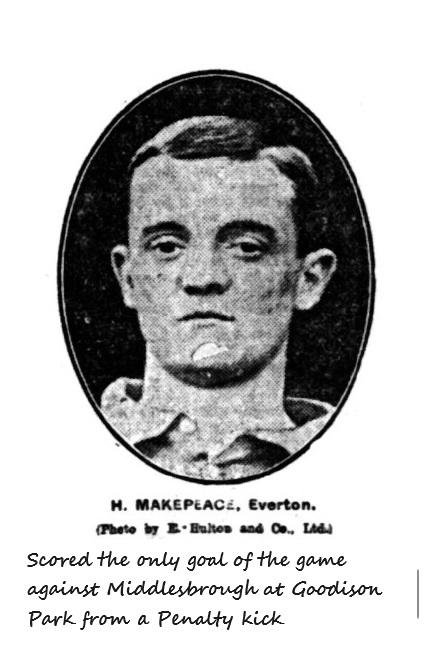 From the manner in which the Evertonians started there were hopes that the spectators would be treated to an inspiriting game, but it was soon evident that such was not to be the case. The home attack did open out the game enough, and the Middlesbrough lot were obviously quite at sea when a chance of scoring came along. Quite early on Roberts made a sad mess of a glorious chance of beating Roose, but he was not alone to blame. Everton undoubtedly had the bulk of the play, and although the plan of attack could scarcely be commended several grand shots were levelled at Williamson who gave a fine exhibition of goalkeeping. When the second half was entered it was hoped that the anxiously awaited goals would be forthcoming, and certainly Taylor and Abbott might easily have beaten an ordinary custodian, but not Williamson. One felt sorry for the latter when his colours were at last lowered. However, he could not be blamed, for Makepeace repeated his Small Heath success, and converted a penalty kick , against Gallium for fouling Young, with the greatest easy. As it happened this proved to be the only occasion when the ball was placed in the net, though just before the finish only a magnificent effort on the part of Roose prevented Middlesbrough equalising.