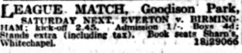 Having gained a good position in the top flight of the First Division the next few matches will largely decide the question as to Everton’s ability to repeat their championship success of last season. There is still a long way to go, but the matches in the immediate future are vital. On Saturday the champions go to Portsmouth, where they have won before, and the players may be depended on to make a great effort to win. Portsmouth are in the last three, and it is obvious that they will be in desperate mood, and particularly anxious to beat Everton. The Goodison Park directors last night decided to rely on the side that defeated Derby County. Martin was injured on Tuesday, but it is expected that he will be all right for this game. The team is;- Davies; Cresswell, O’Donnell; Griffiths, Hart, Virr; Critchley, Dunn, Dean, Martin, Stein. After the match at Portsmouth on Saturday, the players will go on to Brighton for a change of air and a rest.