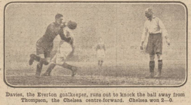 Everton's strong defence in which Common and Kennedy shore, saved them from a heavier defeat. The only goal came three minutes from the end through Wilson. Weldon and Webster constituted Everton's best wing, Forshaw was too well covered by O'Dowd. Everton: - Hardy goal, Common and Kennedy (captain), backs, Scott, Dixon and Curr half-backs, Meston, Webster, Forshaw, Weldon and Lewis, forwards.