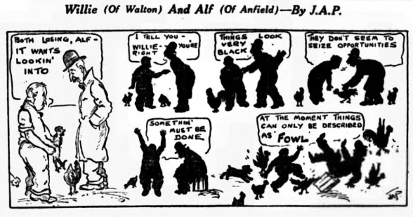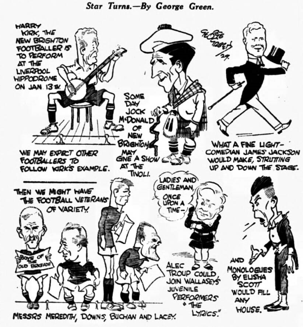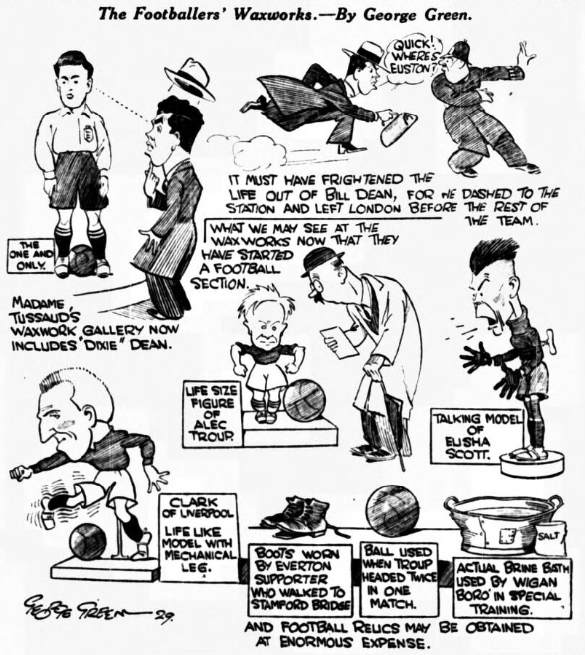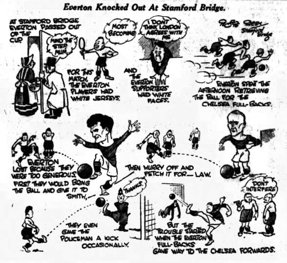 Oh for a Hannen Swaffer in football journalism! (Cries “Clubmoor”). Had that candid critic transferred his activities from the theatrical to the football world, his opinions of the Everton v. Bolton match would have made rich reading. Dean, I fancy, would have received an approving pat on the back for what was, in a real football sense, his best game of the season; mention also would have been made of the short, sharp passing between Everton’s leader and Dunn, which these two players have exploited so successfully of late (Dunn’s last-minute release of the ball for Dean to score the second goal was a joy); and doubtless the wondrous first half triangular stuff of Nuttall, Gibson, and Cook would have been benevolently reviewed. But if I know anything of H.S., he would have devoted most of his space to the outstanding and most disquieting feature of the game- i.e., the neglect of Stein. Now, it sometimes happens that the run of a game leaves a player practically idle; and, again, a player may be so well marked that it would be folly to put the ball his way; but neither of these two factors can explain the starvation of Stein, obvious at least to the crowd on the clock side, who expressed their disapproval. Loyalty to a chum is a splendid virtue, but not when it reacts to the hurt of someone else. You must, in your long experience, have seen the disastrous effects on a young player through the mistaken policy of keeping safe for an absent chum, and I know of no more certain way of souring a man than to give him the impression that certain members of the team do not want him to be a success. There is not a winger in England- not even Alec Jackson –who can teach Stein anything about crossing a ball taking corners; and if he isn’t another George Wall in the making, then I am very greatly mistaken. Dean was above this stuff, and was responsible for the chances that Stein did get. Did you read the heading or the fact that Dunn “gave” Dean a goal by a side of the foot pass, and that Cook and Gibson would lead many defenders a “dog’s life by their mystifying play). Hannen Swaffer would probably have featured Butler’s “starvation,” being of an unbiased mind. I will grant you that Stein was neglected occasionally, but I would not say it was intentional, for Martin served up some great passes to his partner, and Virr divided his attention between Dean and Stein. I don’t think your “grouse” is warranted. All the winners were “starved” in the first quarter of an hour, save Cook who was over-fed. I deny that any player of our clubs would wittingly keep his comrade off the ball.
