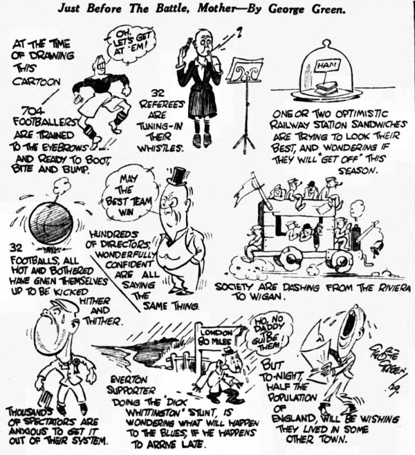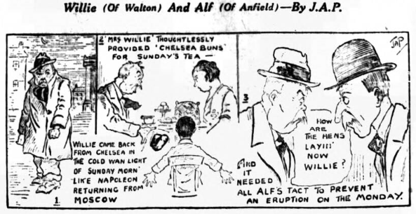 “Floreat Evertonia” writes;- All are agreed that Everton have not come up to expectations and it is patent that the players who were signed at last back-end have not yet blended into a working combination. Still you cannot blame the directors for that. If you will cast your minds back two years ago you will find Everton in the doldrums, scarcely knowing which way to turn to escape relegation (a situation not so dishonorable now, as say, twenty years ago). The perspicacity and sound judgement of the directors not only prevented this indignity, but also paved the way to last year’s championship. Now on collasterall form everybody expected the blues to sweep the board this season, and it has not come off Ergo, scurrilous remarks in the Press and so forth. I will admit sadness over the temporary lapse of my favourite team, but instead of railing at them, I am off to Maine-road on Saturday to cheer them. Whilst feeling that there are misfits in the team, I honestly think that the directors have done their best to provide players worthy the great traditions of a very great club.