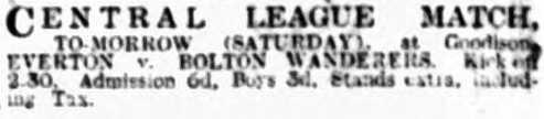 Everton have only dropped 25 per-cent of the total points, possible at home, so it is unlikely in view of the splendid form shown against Bolton and despite the strong Derby bid for First Division ascendancy, that there will be any few today in the Goodison Park camp of disaster. The Derby players have been resting at Southport sine Saturday, and will chosen their team today. Griffiths reintroduction is Everton's only change. Kick off will be at 2-30, and the teams are: - Everton: - Davies; Cresswell, O'Donnell; Griffiths, Hart, Virr; Critchley, Dunn, Dean, Martin and Stein. Derby County: - (probable) –Wilkes; Cooper, Collins; Nicholas, Barker, Storer; Fereday, Whitehouse, Bedford, Stephenson, and Robson.