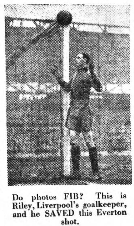 It is worth recording, in view of the debate that must arise over this game that a spectator tells me he saw the linesman on the Bullens-road side flag against Liverpool's goal, just as had the linesman on the grandstand side. Elisha Scott, on two sticks, watched the game from the grandstand. He pulled a muscle in last Wednesday’s game. Everton began the second half with a further dainty touch by Dunn, who revelled in the mud, and did a lot of work in a quiet way. Critchley had too much pace for Bromilow; in fact, Everton's best flank was the right flank. Rigby being rather too definite before shooting.