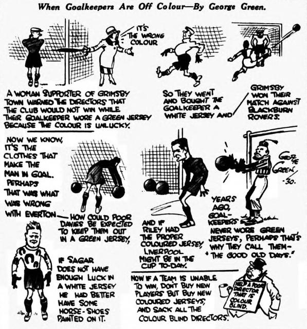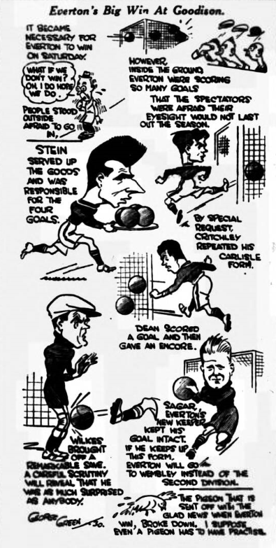 The slogan “What’s wrong with Everton?” is easily answered, says “Speck.” There’s been too much messing the team about. Take the latest muck up. Against Sheffield Wednesday McClure was reported to have played a storming game at centre-half, after which he is playing at left half to make way for White. Why, I ask, all this faith in White? It is inconceivable that a strong player like Ritchie could not have been given a chance at neither centre-half or centre, he has been tried at outside right. I wrote several weeks ago, and then pointed out how surely Everton were sliding; they haven’t half slid since. There is time to save them if only the management will get busy, and it’s not full-backs they want either. We reckon it is time for the directors to call on the older players to play, and with their experience pull them to where they should be (at the top). Then we want a stronger half-back line. This is our team until the injured players are fit. Davies; Cresswell, Williams (Common), Whyte, Griffiths, Hart; Ritchie, Dunn, Dean, (White), White (Martin), Rigby (says “Still Sticking.”)